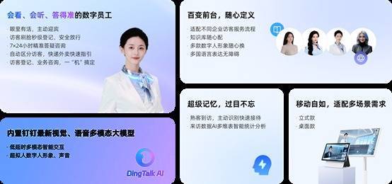该设备提供立式款与桌面款,适用于大堂、前台、岗亭、会议室等不同场景。钉钉称其为“企业的第一张AI名片”,目标是通过7×24小时标准化服务,推动企业接待自动化、服务标准化与运营数据化。